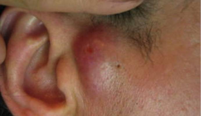 Фурункул – первая причина болезненной припухлости, локализующейся возле ушной раковины. Она опасна гнойными осложнениями в виде абсцессов, флегмон, даже тромбозов и менингита.